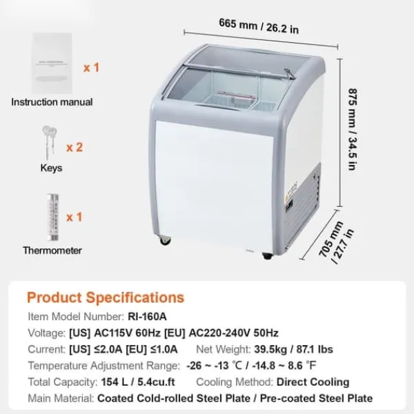 Is-udstillingsskabet har et temperaturjusteringsområde i flere trin på -26 til -13 ℃ / -14,8 til 8,6 ℉ for at imødekomme forskellige frysebehov. Termostaten holder isen i optimal stand, samtidig med at den sparer energi.