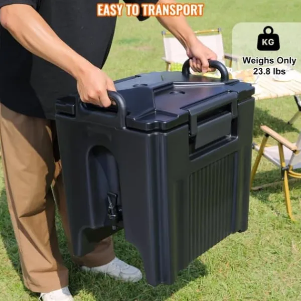 Vores termiske drikkedispenser er lavet af lette materialer og vejer kun 23,8 lbs (10,8 kg). De to ergonomisk formede integrerede håndtag tilpasser sig perfekt til dine fingre, hvilket gør det nemt at løfte og tage den med overalt.