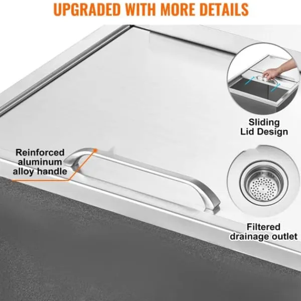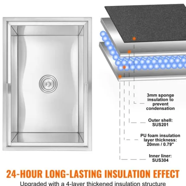 Hele iskisten er fremstillet af rustfrit stål (toplåg + indvendig SUS304, udvendig SUS201), hvilket sikrer holdbarhed og rustbestandighed. Interiøret har en integreret fuldsvejsning, der effektivt reducerer risikoen for lækager.