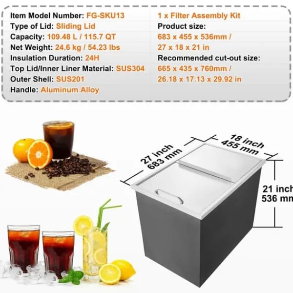En isbeholder med en imponerende stor kapacitet på ca. 115,7 QT (109,48 L), hvilket svarer til omkring 463 kopper 16 oz drikkevarer. Perfekt til opbevaring af store mængder is eller til at holde forskellige drikkevarer kolde.