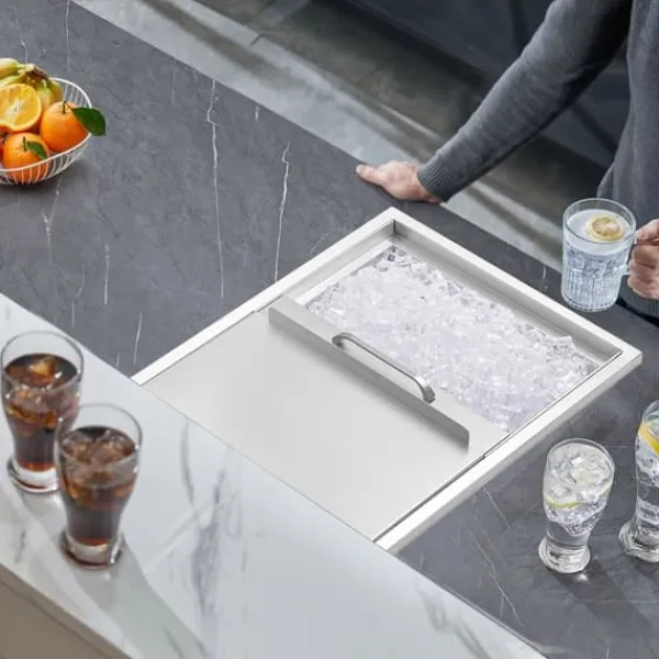 Isopbevaringskisten kan installeres i drikkevarebutikker, hoteller eller bardiske. Velegnet til både indendørs og udendørs køkkenborde. Den indlejrede installation sparer værdifuld plads.