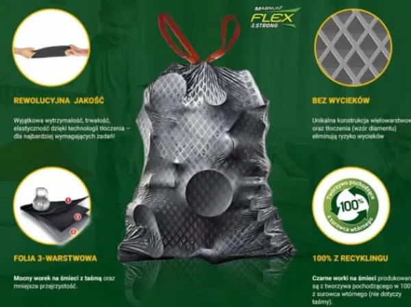 Magnum Flex & Strong poser med tape, som udmærker sig ved innovativ folieprægning, der sikrer rivestyrke. Disse ekstremt stærke og fleksible poser strækker sig under tryk i stedet for at sprænges, hvilket garanterer deres pålidelighed i enhver situation.