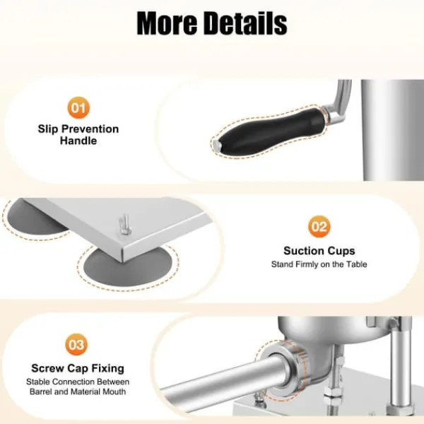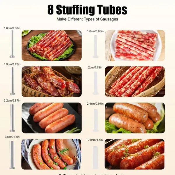 Vælg mellem seks rørstørrelser fordelt på plast og rustfrit stål, så du kan matche tarme og opskrift. Skruelåget ved udløbet øger stabiliteten, og den aftagelige konstruktion forenkler rengøring og opbevaring.