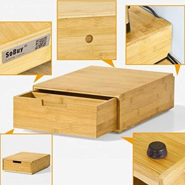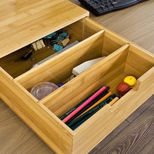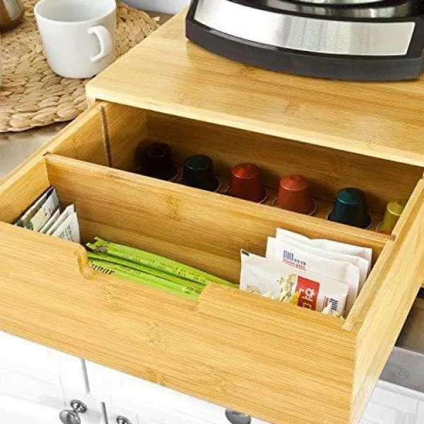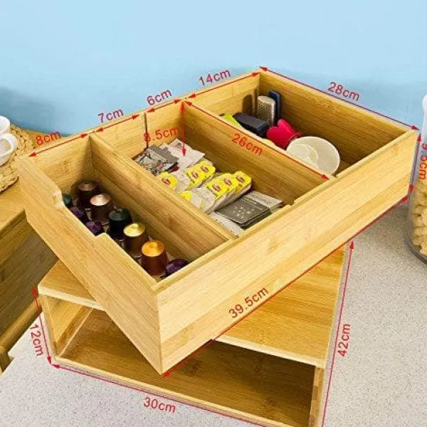 Detaljer: Skuffe med 3 justerbare komponenter er ideel til opbevaring af alle typer kaffekapsler eller teposer. Derudover byder den på praktisk opbevaringsplads til kaffen, theen eller kopperne. Med denne boks skaber du orden og sparer også plads. Den er også ideel til kontoret. Du kan bruge den som skrivebordsarrangør. Organizeren er velegnet til opbevaring af nåle, sakse, brevåbnere og andet skrivebordstilbehør. Letløbende skuffer med grebshul for nem afmontering. Skridsikker, monteret med 4 gummifødder i bunden af kassen, hvilket sikrer en sikker stående. Produktdetaljer Materiale: Bambus. Mål: B30 x D42 x H12cm. Vægt: 4 kg. Bæreevne: 10 kg. Ingen montering nødvendig. Klar til brug. De dekorative elementer er ikke inkluderet i leverancen. Kontakt os venligst via e-mail, når du har spørgsmål, vi vil svare så hurtigt som muligt!