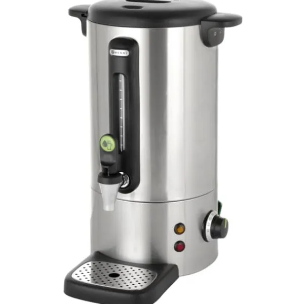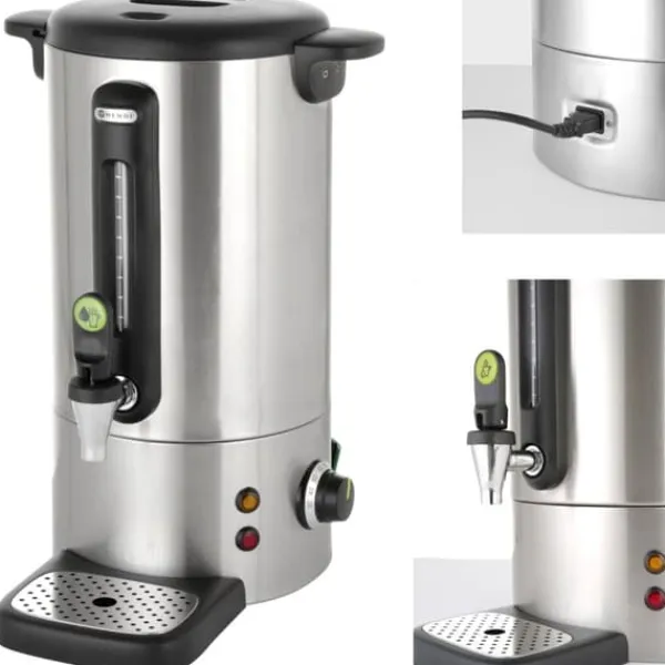 Producentkode: 211410 CONCEPT LINE kaffevarmeren er designet af den berømte hollandske designer Robert Bronwasser. Det unikke design og sans for detaljer gør enheden til et rigtigt blikfang ved enhver buffet. Enheden har et enkeltvægget rustfrit stålhus, der er udført i mat sort med stilfulde polypropylenhåndtag og dæksel. Den centralt placerede vandhane forhindrer dryp, og glasindikatoren viser vandstanden. Den magnetisk fastgjorte drypbakke sikrer nem tømning. Indikatorlyset signalerer afslutningen af opvarmningsprocessen og det mulige behov for at fjerne kalk. Kedlen holder drikken på serveringstemperatur efter opvarmning. Ikke egnet til chokolademælk. Produktegenskaber: – Designet af Robert Bronwasser, – Rustfrit stålhus i en elegant sort måtte, – Drypfri vandhane, – Vandstandsindikator i glas, – Nem tømning af drypbakken, – Indikatorlys informerer, når opvarmningen er færdig, og ved afkalkning er nødvendig, – Holder drikken ved serveringstemperatur, – Ikke egnet til chokolademælk. Tekniske parametre: – Katalognummer – 211410 – Stand – Ny – Kapacitet – 10 l – Spænding – 230 V – Effekt – 950 W – Dimensioner – 307x330x(H)450 mm Sættet indeholder: – Kaffekomfur
