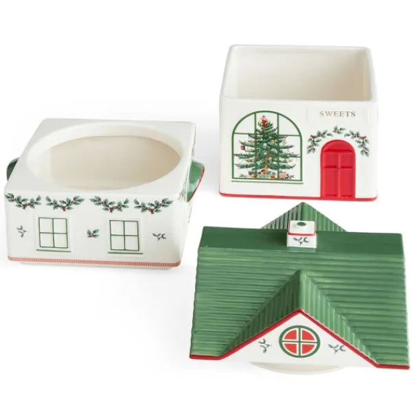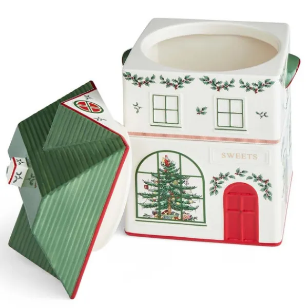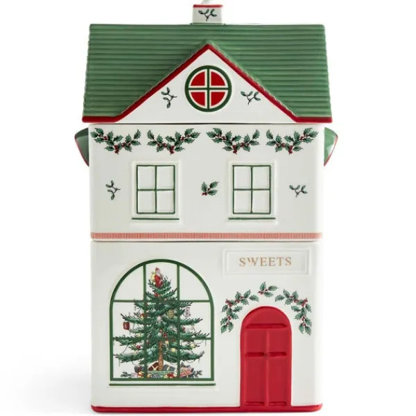 Christmas Village Kagedåse, 2 Etager, spreder juleglæde i køkkenet med sit legende design. Den er fremstillet i keramik og formet som en gammeldags slikbutik med rød dør, buede vinduer og grønt tag. Dåsen består af tre stabelbare dele – perfekt til at opbevare julegodter, bageingredienser eller andre køkkenfavoritter på en både praktisk og dekorativ måde.