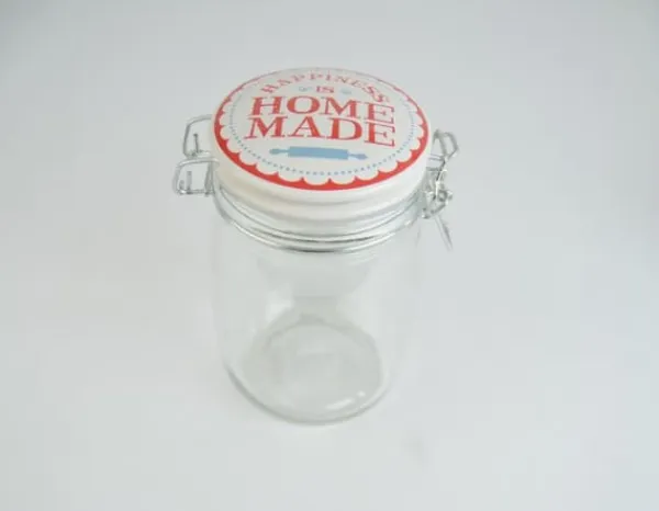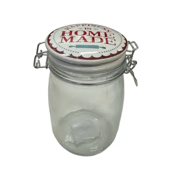 Traditionell glasburk med snäpplock i keramik med texten “Happiness is Home Made”