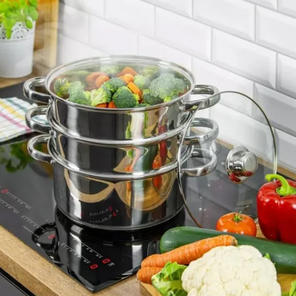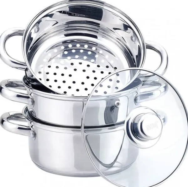 Sættet med dampende gryder er lavet af rustfrit stål af høj kvalitet. Det anvendte stål består af den bedste kvalitetslegering, der almindeligvis anvendes i produkter i verdensklasse, hvilket garanterer dets høje korrosionsbestandighed og meget gode holdbarhed. Det anvendte materiale gør, at maden kan opvarmes hurtigt og holder sig varm i længere tid. Produktet er velegnet til madlavning på induktions-, gas-, el-, keramiske og halogenkomfurer. Det kan sikkert vaskes i en opvaskemaskine. Gryderne har ikke-varme håndtag. Grydens vægge opvarmes meget langsommere end bunden, hvilket giver mulighed for korrekt cirkulation af fugtig luft inde i gryden. kogepunkt. Sådanne termiske forhold gør det muligt at bevare mineraler, vitaminer og næringsværdier i retter. Tykkelsen af grydevæggene er ca. 1 mm. Grydens batteri-termiske bund har en speciel aluminiumsplade, der giver mulighed for lagring og jævn fordeling af varme inde i gryden Sættet er nemt at holde rent. Diameteren på gryderne i dette sæt er 24 cm. Sættet indeholder: – 5 liters basiskande damp – 2 stk – glasdæksel