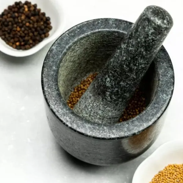En solid køkkenmørtel med en diameter på 12 cm. Klassisk form, massiv, lavet af hård sten. Et uundværligt tilbehør til at male krydderier, krydderurter, sukker til pulveriseret sukker, tilberedning af saucer og pastaer, eller friske krydderiblandinger af ekstremt hård naturlig granit Smukt ud som et kunstværk, vil det være en synlig dekoration i dit køkken. Specifikation:- Sabotagemål: 15,5 cm- Mørtelstørrelse: Ø12 x12 cm- Materiale: Naturgranit