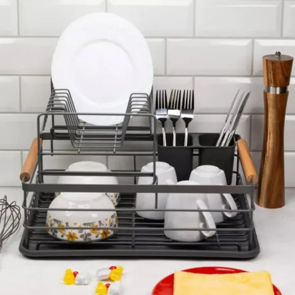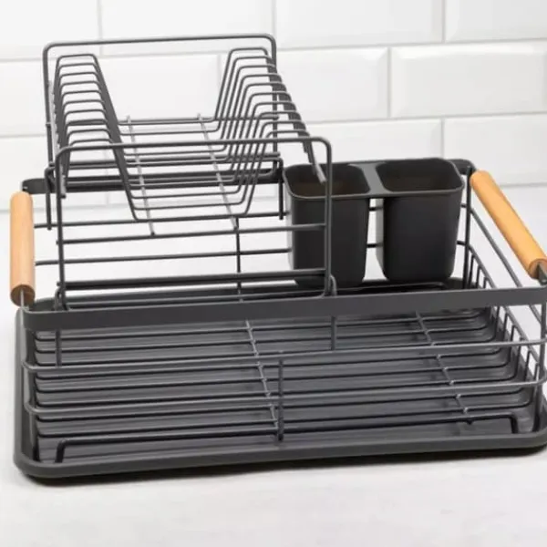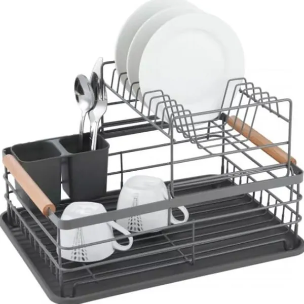 Tørretumbleren kan bruges i både store og små køkkener. Den universelle farve får den til at se godt ud i ethvert interiør. Opvaskeafløbet er desuden udstyret med en praktisk bestikbeholder. Opdeling i 2 rum gør det nemt at sortere skeer, gafler og knive. Produktet gør det nemmere at holde orden i køkkenet. Opvasketørreren i to niveauer er stabil, hvilket sikrer sikker brug. Produktet har specialdesignede ben, solidt forbundet til tørretumbleren. Takket være dette er der ingen risiko for at vælte, selv når den er tungt læsset med service. Funktioner: Højkvalitets, pulverlakeret metalramme Holdbar metalkonstruktion Opvaskestativet har komfortable træbærehåndtag på begge sider, der kan bruges til at hænge et viskestykke. Lille afløb med riller, så du kan placere et maks. antal tallerkener Bakke i bunden forhindrer køkkenet i at blive vådt Kun håndvask, tør umiddelbart efter vask Aftageligt plastik afløb til bestik Grå farve Mål: 43x32x27 cm