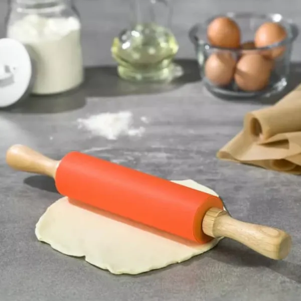 Kagerulle med silikoneoverflade og træhåndtag Temperaturbestandig silikone i topkvalitet. Non-stick overflade. Absorberer ikke lugte eller væsker. Let at vaske. Størrelse: 39,5 x 5,3 cm. Tilgængelige farver: orange