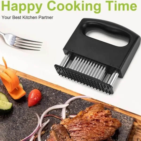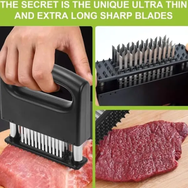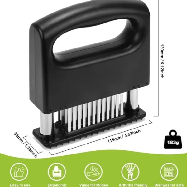 48 ULTRASKARPE NÅLE I RUSTFRIT STÅL: Nåletræbladene sikrer grundig mørning ved at trænge dybt ind i kødet og bryde de hårde fibre. Perfekt til bøf, kylling og svinekød – giver saftige og velsmagende resultater hver gang.