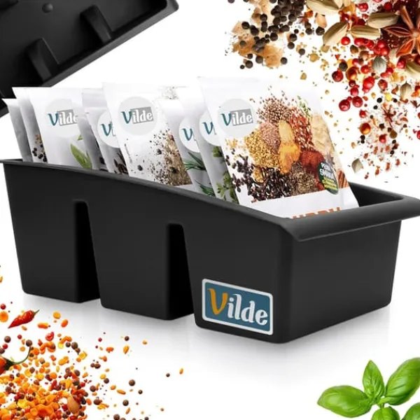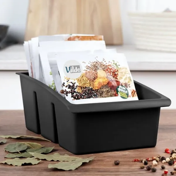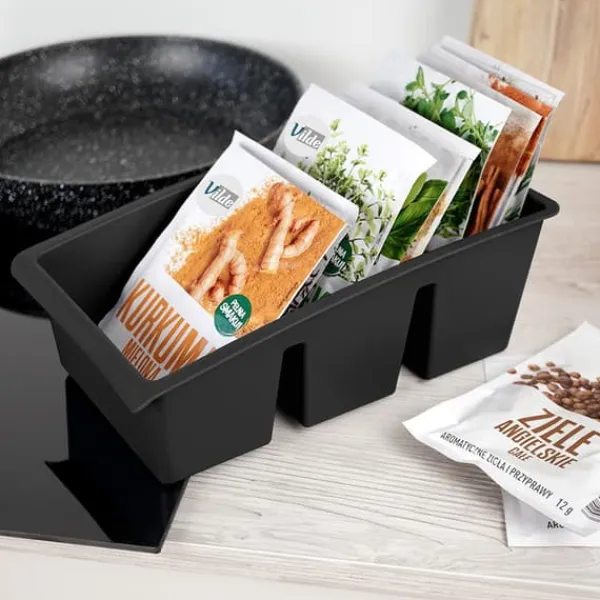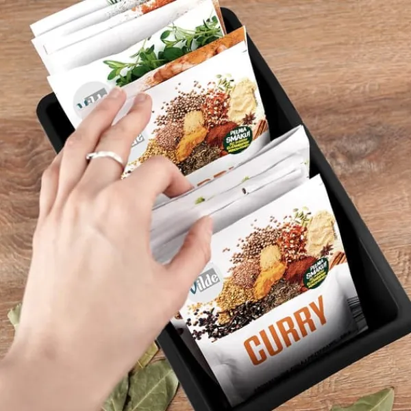 Krydderibeholder til køkkenet i en pose. Solidt lavet af let sort plastik. Den hjælper dig med at holde orden i dit krydderiskab. Den hjælper dig med at sortere dine krydderier og altid have produktet lige ved hånden. Du finder hurtigt den rigtige pose. Beholderen giver dig mulighed for at opbevare posen i sit rum og forhindrer krydderier i at spildes. Krydderier og krydderurter holdes organiseret, og én organizer kan indeholde flere poser med forskellige produkter. Originalt Vilde-produkt. Fremstillet i overensstemmelse med europæiske standarder.