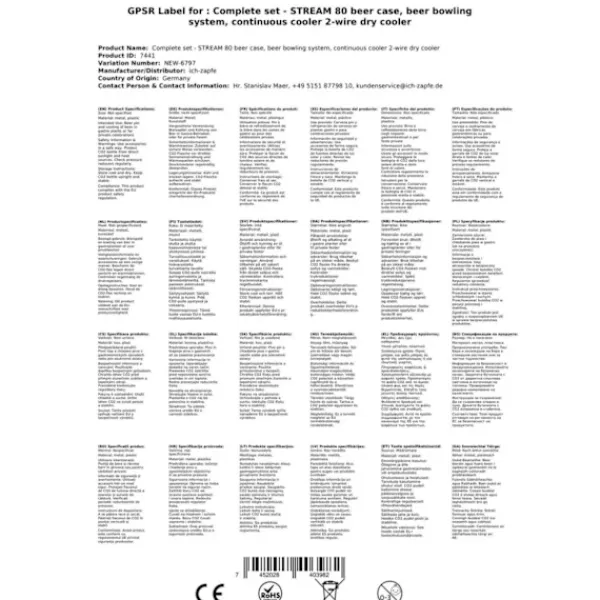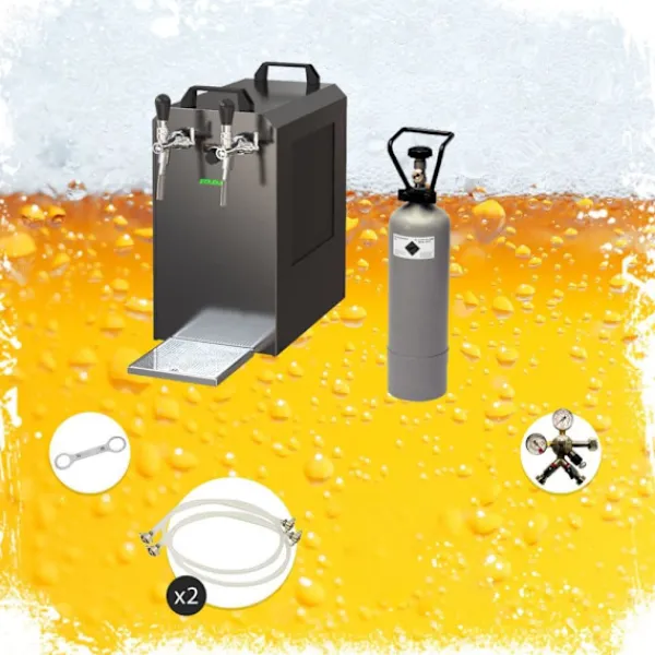 Komplet Sæt -fadølsanlæg – STREAM 80 ølkasse, flowkøler 2-linet tørkøler Består af:•STREAM 80 ølkasse, flowkøler 2-linet tørkøler!•Features:tilslutninger John Gæst•1 x Regulator 2 linjer CO2 for øl dispenser 3 bar•1 x CO2 – flaske 2,0 kg•2 X CO2 slange komplet, 1,5 m•2 X øl slange John Gæst – 3/8 og 5/8 skrue-on stik 2,00 m – helt færdig•kulsyre nøgle fangenskab•2 x pin hoved, dit valg: ingen, flad, stationcar, kurv, Kopi Zapfanlæg STREAM 80 Ølkasse, gennemløbskøler med 2 rør, tørkøler, op til 90 liter/timeZapfanlæg STREAM 80 Ølkasse, gennemløbskøler med 2 rør, tørkøler, op til 90 liter/time3 minutter at pakke ud… 2 minutter at opstille… 1 minut at tilslutte = uendelig nydelse.En kold, klar, frisktappet – du har fortjent det!Ølkøleren STREAM 80 2lt er designet til professionel køling og udskænkningaf fremragende afkølet øl i hjemmet, til havefesterog til mellemstore kommercielle formål.•Reguleringsområde+2 til +10 grader•Ydelse:90 L/time ved 10°C TD•Køleteknologier 45% mere effektiv•Klar til brugpå kun 5-10 minutterHvis termostaten indstilles på Max.,vil termoblokken (efter ca. 10 minutter) akkumulere en stor mængdeenergi, og dermed muliggøre udskænkning afflere afkølede øl efter hinanden.Køleteknologien i STREAM 80 Zapfanlægget er omkring 45% mere effektiv end det elektriske effektforbrug.Øllet køles ned til taphanen.Kølesløjferne er lavet af rustfrit stål og er derfor stabile og holdbare.De anvendte materialer opfylder de højeste hygiejnestandarder og sikrer en lang levetid for køleren. STREAM 80 2lt – og den kolde øl strømmer fra 2 hanerMed sin stærke køleydelse og perfekte dimensioner hører ølanlægget STREAM 80 til de førende 2-kanals bord-/underbordskølere på markedet.Køleydelse fra 170 til 180 glas (0,5 liter) fremragende afkølet øl pr. time,Den kraftige kompressor i STREAM 80 sikrer minimalt energiforbrug og fremragende afkølet øl uden at skummeGennemløbskøler STREAM 80 2ltg. – Effektivitet, Ydelse, NydelseTermoblokken i STREAM 80 Bierzapfanlægget har høj energikapacitet, således at der allerede efter 5-10 minutter kan tappes perfekt afkølet øl.Hvis termostaten indstilles på Max., vil termoblokken (efter ca. 10 minutter) akkumulere en stor mængde energi, og dermed muliggøre udskænkning af flere afkølede øl efter hinanden.Køleteknologien i STREAM 80 Zapfanlægget er omkring 45% mere effektiv end det elektriske effektforbrug.Øllet køles ned til taphanen.Kølesløjferne er lavet af rustfrit stål og er derfor stabile og holdbare.De anvendte materialer opfylder de højeste hygiejnestandarder og sikrer en lang levetid for køleren.Gennemløbskøler STREAM 80 – Tekniske specifikationerDen elegante STREAM 80 tørkøler med en vægt på kun 45 kg er udstyret med en 7 mm ledning.•Mål:(BxDxH) 255х635х510 mm (inkl. drypbakke)•Strøm:220V, 50 Hz, 764W, 4,3A•Kompressor:3/8 PS•Ledning:2 x øltyper•Kabinet:Metal, pulverlakeret, rustsikkerHøj kvalitet af bearbejdning og emballering STREAM 80 – Topklasse blandt 2-kanals ølanlægØlkøleren STREAM 80 er i kategorien Ølanlæg op til 90 l/time en af de bedste med hensyn til pris-,ydelses-, kvalitetsforhold.Let rengøring af STREAM 80Med følgende rengøringssæt kan du nemt og bekvemt rengøre STREAM 80 øltappelægget efter brug:Rengøringssæt lilleNem rengøringssæt(anbefales)Rengøringssæt stortZapfanlæg STREAM 80 – Ølkasse, gennemløbskøler med 2 rør, tørkøler, op til 60 liter/timeDet er hurtigt at tappe:Pak zapfanlægget udForbind reduktionsventilen til CO2-flasken med hjælp fra kulsyreslange-nøglen og stram tilForbind CO2-slangen fra reduktionsventilen til taphovedetForbind ølslangen til taphovedet og indsæt og fastgør den i zapfanlæggetStik fatningenIndstil trykket på reduktionsventilenForbind zapfanlægget til stikkontaktenIndstil trykket og nyd en kold øl