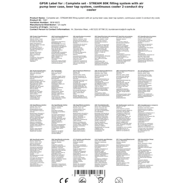 Complete Set fadølsanlæg STREAM 80K med luftpumpe, ølkasse, flowkøler 2-linet tørkøler Består af: •STREAM 80K med luftpumpe, ølkasse, flowkøler 2-linet tørkøler •tilslutninger: John Gæst • 2x trykluftslange komplet John Gæst 5/16 til 3 / 4 skrue at skrue det på hanen hovede•2x øl slange komplet John Gæst 3/8 til 5/8 skrue at skrue det på hanen hoveder •2x tap lederne af dit valg (uden tap hoveder, 5 liter adaptere, flad, ejendom, Kopi, trekantede, kurv) Fadølsanlæg STREAM 80K med luftpumpe, ølkasse, flowkøler 2-linet tørkøler Fadølsanlæg STREAM 80K med 2 rør, 90 liter/time, gennemløbskøler, tørkøler 3 minutters udpakning… 2 minutters opsætning… 1 minut tilslutning = uendelig nydelse.En kold, klar, frisktappet – du har fortjent det!Ølkøleren STREAM 80K 2lt er designet til professionel køling og serveringaf fremragende kølet øl i hjemmet, til havefesterog til brug i mellemstore kommercielle miljøer. •Reguleringsområde+2 til +10 grader•Ydelse:90 L/time ved 10°C TD•Køleteknologier 45% mere effektiv•Klar til brugpå kun 5-10 minutter Hvis termostaten indstilles til Max.,vil termoblokken (efter ca. 10 minutter) akkumulere en stor mængdeenergi, hvilket muliggør servering afflere kolde øl i træk.Køleteknologien i STREAM 80K zapfanlægget er ca. 45% mere effektiv end den elektriske strømforbrug.Øllet køles ned til hanen.Kølesløjferne er lavet af rustfrit stål og er derfor stabile og holdbare. De anvendte materialer lever op til de højeste hygiejnestandarder og sikrer en lang levetid for køleren. STREAM 80K 2lt – og den kolde øl strømmer fra 2 haner Med sin kraftige køleydelse og perfekte dimensioner hører zapfanlægget STREAM 80K til de førende 2-rørs bord-/undertællerkølere på markedet. Køleydelse på 170 til 180 glas (0,5 liter) fremragende kølet øl pr. time, Den kraftfulde kompressor STREAM 80K sikrer minimalt energiforbrug og en fremragende kølet øl uden at skumme. Gennemløbskøler STREAM 80K 2ltg. – Effektivitet, Ydelse, Nydelse Termoblokken i STREAM 80K ølzapfanlægget har høj energikapacitet, så der kan tappes perfekt kølet øl allerede efter 5-10 minutter Hvis termostaten indstilles til Max., vil termoblokken (efter ca. 10 minutter) akkumulere en stor mængde energi, hvilket muliggør servering af flere kolde øl i træk. Køleteknologien i STREAM 80K zapfanlægget er ca. 45% mere effektiv end den elektriske strømforbrug. Øllet køles ned til hanen. Kølesløjferne er lavet af rustfrit stål og er derfor stabile og holdbare. De anvendte materialer lever op til de højeste hygiejnestandarder og sikrer en lang levetid for køleren. STREAM 80K Gennemløbskøler – Tekniske specifikationer Den Elegante STREAM 80K tørkøler med en vægt på kun 45 kg er udstyret med et 7 mm rør. •Mål: (BxTxH) 255х635х510 mm (inkl. drypbakke)•Strømtilførsel: 220V, 50 Hz, 804W, 4,5A•Kompressor:3/8 PS•Rør: 2 x øltyper•Kabinet: Metal, pulverlakeret, rustsikkert Høj kvalitet af forarbejdning og emballage STREAM 80K – Top i klassen af 2-rørs fadølsanlæg Ølkøleren STREAM 80K er i kategorien Fadølsanlæg op til 90 l/time en af de bedste med hensyn til pris-, ydelses-, kvalitetsforhold. Let rengøring af STREAM 80K Med følgende rengøringssæt kan du nemt og bekvemt rengøre STREAM 80K zapfanlægget efter brug: Rengøringssæt lille Nem rengøringssæt (anbefales) Rengøringssæt stort Fadølsanlæg STREAM 80K – gennemløbskøler med 2 rør, tørkøler, op til 90 liter/time Det tappes med få håndtag: Udpakning af zapfanlægget Reduceringsventilen tilsluttes CO2-flasken med hjælp fra kulsyre-nøglen og strammes CO2-slange fra reduceringsventilen tilsluttes taphovedet Ølslange tilsluttes taphovedet og sættes i zapfanlægget og fastgøres Fadet stikkes Indstil trykket på reduceringsventilen Tilslut zapfanlægget til stikkontakten Indstil trykket og nyd den kolde øl