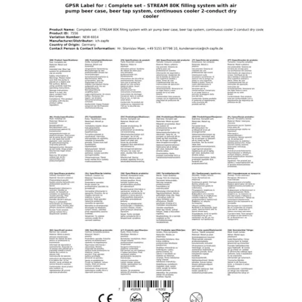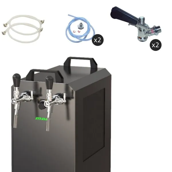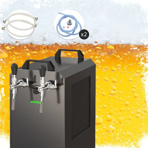 Complete Set fadølsanlæg STREAM 80K med luftpumpe, ølkasse, flowkøler 2-linet tørkøler Består af: •STREAM 80K med luftpumpe, ølkasse, flowkøler 2-linet tørkøler •tilslutninger: John Gæst • 2x trykluftslange komplet John Gæst 5/16 til 3 / 4 skrue at skrue det på hanen hovede•2x øl slange komplet John Gæst 3/8 til 5/8 skrue at skrue det på hanen hoveder •2x tap lederne af dit valg (uden tap hoveder, 5 liter adaptere, flad, ejendom, Kopi, trekantede, kurv) Fadølsanlæg STREAM 80K med luftpumpe, ølkasse, flowkøler 2-linet tørkøler Fadølsanlæg STREAM 80K med 2 rør, 90 liter/time, gennemløbskøler, tørkøler 3 minutters udpakning… 2 minutters opsætning… 1 minut tilslutning = uendelig nydelse.En kold, klar, frisktappet – du har fortjent det!Ølkøleren STREAM 80K 2lt er designet til professionel køling og serveringaf fremragende kølet øl i hjemmet, til havefesterog til brug i mellemstore kommercielle miljøer. •Reguleringsområde+2 til +10 grader•Ydelse:90 L/time ved 10°C TD•Køleteknologier 45% mere effektiv•Klar til brugpå kun 5-10 minutter Hvis termostaten indstilles til Max.,vil termoblokken (efter ca. 10 minutter) akkumulere en stor mængdeenergi, hvilket muliggør servering afflere kolde øl i træk.Køleteknologien i STREAM 80K zapfanlægget er ca. 45% mere effektiv end den elektriske strømforbrug.Øllet køles ned til hanen.Kølesløjferne er lavet af rustfrit stål og er derfor stabile og holdbare. De anvendte materialer lever op til de højeste hygiejnestandarder og sikrer en lang levetid for køleren. STREAM 80K 2lt – og den kolde øl strømmer fra 2 haner Med sin kraftige køleydelse og perfekte dimensioner hører zapfanlægget STREAM 80K til de førende 2-rørs bord-/undertællerkølere på markedet. Køleydelse på 170 til 180 glas (0,5 liter) fremragende kølet øl pr. time, Den kraftfulde kompressor STREAM 80K sikrer minimalt energiforbrug og en fremragende kølet øl uden at skumme. Gennemløbskøler STREAM 80K 2ltg. – Effektivitet, Ydelse, Nydelse Termoblokken i STREAM 80K ølzapfanlægget har høj energikapacitet, så der kan tappes perfekt kølet øl allerede efter 5-10 minutter Hvis termostaten indstilles til Max., vil termoblokken (efter ca. 10 minutter) akkumulere en stor mængde energi, hvilket muliggør servering af flere kolde øl i træk. Køleteknologien i STREAM 80K zapfanlægget er ca. 45% mere effektiv end den elektriske strømforbrug. Øllet køles ned til hanen. Kølesløjferne er lavet af rustfrit stål og er derfor stabile og holdbare. De anvendte materialer lever op til de højeste hygiejnestandarder og sikrer en lang levetid for køleren. STREAM 80K Gennemløbskøler – Tekniske specifikationer Den Elegante STREAM 80K tørkøler med en vægt på kun 45 kg er udstyret med et 7 mm rør. •Mål: (BxTxH) 255х635х510 mm (inkl. drypbakke)•Strømtilførsel: 220V, 50 Hz, 804W, 4,5A•Kompressor:3/8 PS•Rør: 2 x øltyper•Kabinet: Metal, pulverlakeret, rustsikkert Høj kvalitet af forarbejdning og emballage STREAM 80K – Top i klassen af 2-rørs fadølsanlæg Ølkøleren STREAM 80K er i kategorien Fadølsanlæg op til 90 l/time en af de bedste med hensyn til pris-, ydelses-, kvalitetsforhold. Let rengøring af STREAM 80K Med følgende rengøringssæt kan du nemt og bekvemt rengøre STREAM 80K zapfanlægget efter brug: Rengøringssæt lille Nem rengøringssæt (anbefales) Rengøringssæt stort Fadølsanlæg STREAM 80K – gennemløbskøler med 2 rør, tørkøler, op til 90 liter/time Det tappes med få håndtag: Udpakning af zapfanlægget Reduceringsventilen tilsluttes CO2-flasken med hjælp fra kulsyre-nøglen og strammes CO2-slange fra reduceringsventilen tilsluttes taphovedet Ølslange tilsluttes taphovedet og sættes i zapfanlægget og fastgøres Fadet stikkes Indstil trykket på reduceringsventilen Tilslut zapfanlægget til stikkontakten Indstil trykket og nyd den kolde øl