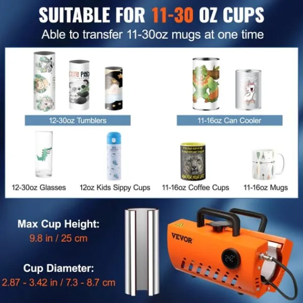- 30oz Ekstra Stor Kapacitet: Med evnen til at presse 2 krus ad gangen rummer denne tumbler-varmepressmaskine forskellige koppes størrelser, herunder store aluminiumsflasker, vinglas, tumblers og kaffekrus. Den 30oz kapacitet sikrer alsidighed og bekvemmelighed til alle dine sublimeringsbehov.