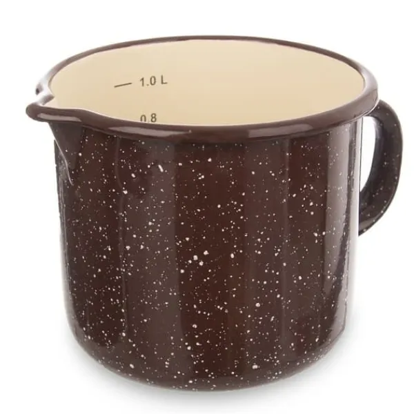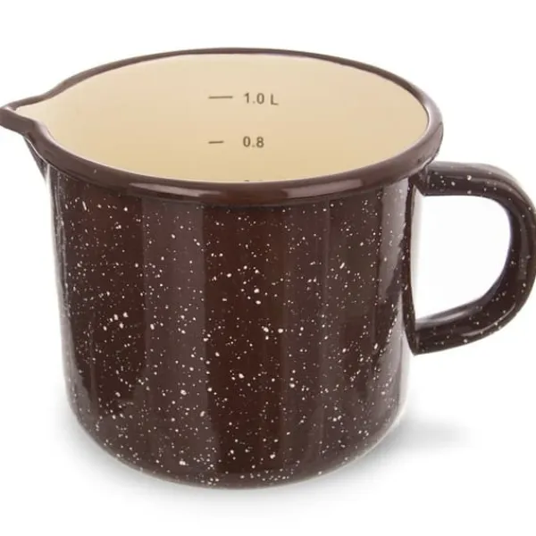 Emaljeret krus med målebæger, tud og hank i retrostil. Lavet af holdbare materialer, der gør det yderst praktisk og behageligt. Det kan bruges til at tilberede og måle ingredienser under madlavning, bagning eller tilberedning af drikkevarer. Takket være dets alsidige anvendelse er det også perfekt til at lave saucer, buddinger eller til at smelte chokolade til desserter. Dets unikke design gør kruset til en unik køkkendekoration. Emaljeret køkkengrej kan have produktionsfejl, der er naturlige for denne type køkkengrej: buler, asymmetriske tryk osv. Disse påvirker ikke produktets kvalitet eller de tilberedte retter; de understreger blot den traditionelle tilberedning. Kruset har en lille bunddiameter; ikke alle induktionskogeplader er kompatible; Se venligst manualen til din kogeplade. Originalt produkt fra det tjekkiske mærke Orion. Fremstillet i overensstemmelse med europæiske standarder.