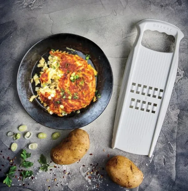 Tilbered kartoffelpandekager og schweizisk roesti hurtigt og nemt! Med vores Boerner Roesti PowerLine kan du nemt forvandle kogte eller rå kartofler til lækre retter. Produktdata: nyt design fra Boerner i 5 farver robust skærer til stegte kartofler, stegte kartofler og ost ekstremt slidstærk skæreflade nem og effektiv at bruge fri for blødgørere og BPA levering uden frugtholder. Bestil venligst separat hvis nødvendigt.