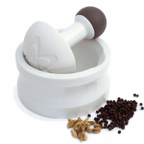 Den smarta designen med en överdimensionerad stöt som passar tätt med morteln och som kan roteras i cirklar gör att den är skonsam även för dig som har problem med ledvärk och dylikt.
