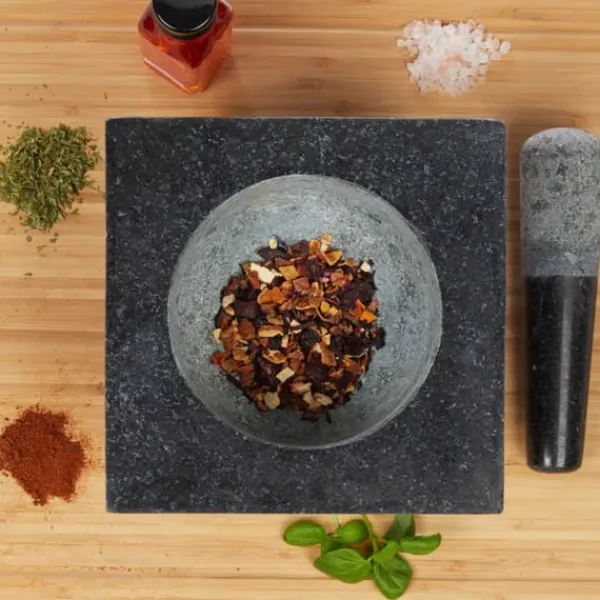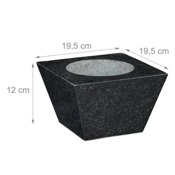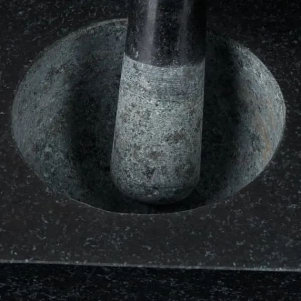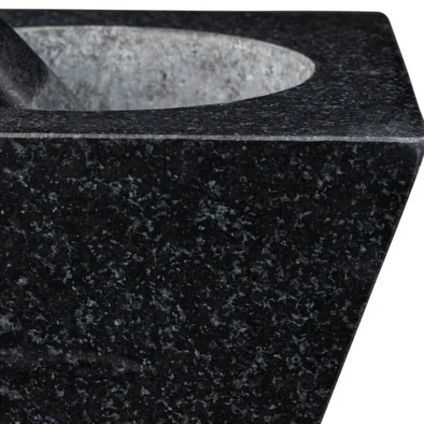 Tilbered nemt friske saucer, pesto og krydderiblandinger med denne store firkantede morter og støder i granit. Fremstillet af robust natursten, har den en ru inderside og støderende for effektiv maling, hvilket gør den ideel til at knuse urter, krydderier og nødder. Den polerede yderside tilføjer et stilfuldt præg til ethvert køkken og sikrer holdbarhed til daglig brug.