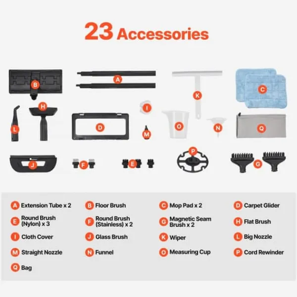 Fugedamprenseren leveres med omfattende tilbehør, herunder forlængerrør, børster, klude og dyser, der effektivt takler enhver rengøringsopgave.