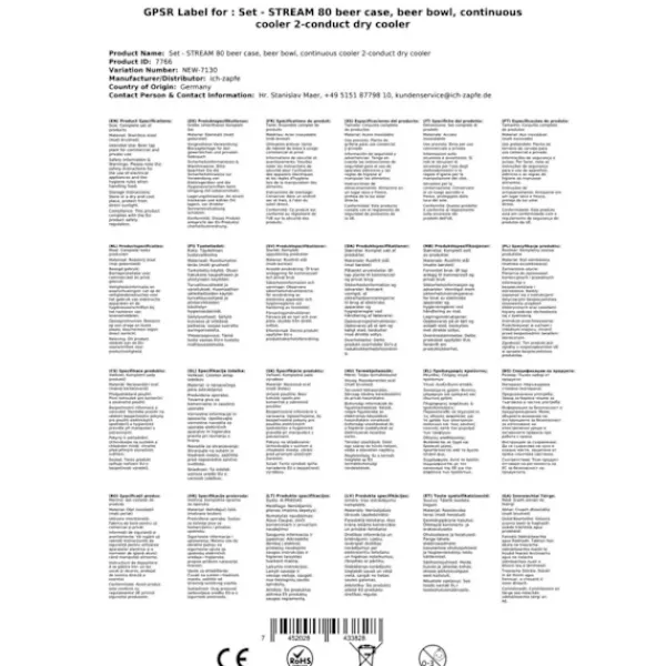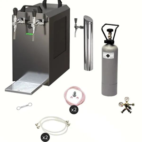 Under-counter komplet sæt – fadølsanlæg STREAM 80 ølkasse, gennemstrømningskøler 2-linjers tørkøler Består af: •Fadølsanlæg STREAM 80 ølkasse, gennemstrømningskøler 2-linjers tørkøler•Forbindelser: John Guest•1x dispenser / pumpetårn, matbørstet, 2-sidet•2 x ølslange 7mm komplet, klar, 3,0 m•2 x rengøringsadapter 30 mm•1 x trykreduktion 2-sidet CO2 til øl dispenser 3bar•1 x CO2-flaske, 2,0 kg•2 x CO2-slange komplet, 1,5 m•2 x ølslange John Guest – 3/8 og 5/8 skruestik 2,00 m – helt færdig!•Kuldioxidnøgle fanget•2 x dispenseringshoved, dit valg: uden, flad, kombi, kurv, Köpi Zapfanlæg STREAM 80 Ølkasse, gennemløbskøler med 2 rør, tørkøler, op til 90 liter/time Zapfanlæg STREAM 80 Ølkasse, gennemløbskøler med 2 rør, tørkøler, op til 90 liter/time 3 minutter at pakke ud… 2 minutter at opstille… 1 minut at tilslutte = uendelig nydelse.En kold, klar, frisktappet – du har fortjent det!Ølkøleren STREAM 80 2lt er designet til professionel køling og udskænkningaf fremragende afkølet øl i hjemmet, til havefesterog til mellemstore kommercielle formål. •Reguleringsområde+2 til +10 grader•Ydelse:90 L/time ved 10°C TD•Køleteknologier 45% mere effektiv•Klar til brugpå kun 5-10 minutter Hvis termostaten indstilles på Max.,vil termoblokken (efter ca. 10 minutter) akkumulere en stor mængdeenergi, og dermed muliggøre udskænkning afflere afkølede øl efter hinanden.Køleteknologien i STREAM 80 Zapfanlægget er omkring 45% mere effektiv end det elektriske effektforbrug.Øllet køles ned til taphanen.Kølesløjferne er lavet af rustfrit stål og er derfor stabile og holdbare. De anvendte materialer opfylder de højeste hygiejnestandarder og sikrer en lang levetid for køleren. STREAM 80 2lt – og den kolde øl strømmer fra 2 haner Med sin stærke køleydelse og perfekte dimensioner hører ølanlægget STREAM 80 til de førende 2-kanals bord-/underbordskølere på markedet. Køleydelse fra 170 til 180 glas (0,5 liter) fremragende afkølet øl pr. time, Den kraftige kompressor i STREAM 80 sikrer minimalt energiforbrug og fremragende afkølet øl uden at skumme Gennemløbskøler STREAM 80 2ltg. – Effektivitet, Ydelse, Nydelse Termoblokken i STREAM 80 Bierzapfanlægget har høj energikapacitet, således at der allerede efter 5-10 minutter kan tappes perfekt afkølet øl. Hvis termostaten indstilles på Max., vil termoblokken (efter ca. 10 minutter) akkumulere en stor mængde energi, og dermed muliggøre udskænkning af flere afkølede øl efter hinanden. Køleteknologien i STREAM 80 Zapfanlægget er omkring 45% mere effektiv end det elektriske effektforbrug. Øllet køles ned til taphanen. Kølesløjferne er lavet af rustfrit stål og er derfor stabile og holdbare. De anvendte materialer opfylder de højeste hygiejnestandarder og sikrer en lang levetid for køleren. Gennemløbskøler STREAM 80 – Tekniske specifikationer Den elegante STREAM 80 tørkøler med en vægt på kun 45 kg er udstyret med en 7 mm ledning. •Mål: (BxDxH) 255х635х510 mm (inkl. drypbakke)•Strøm: 220V, 50 Hz, 764W, 4,3A•Kompressor: 3/8 PS•Ledning: 2 x øltyper•Kabinet: Metal, pulverlakeret, rustsikker Høj kvalitet af bearbejdning og emballering STREAM 80 – Topklasse blandt 2-kanals ølanlæg Ølkøleren STREAM 80 er i kategorien Ølanlæg op til 90 l/time en af de bedste med hensyn til pris-,ydelses-, kvalitetsforhold. Let rengøring af STREAM 80 Med følgende rengøringssæt kan du nemt og bekvemt rengøre STREAM 80 øltappelægget efter brug: Rengøringssæt lille Nem rengøringssæt (anbefales) Rengøringssæt stort Zapfanlæg STREAM 80 – Ølkasse, gennemløbskøler med 2 rør, tørkøler, op til 60 liter/time Det er hurtigt at tappe: Pak zapfanlægget ud Forbind reduktionsventilen til CO2-flasken med hjælp fra kulsyreslange-nøglen og stram til Forbind CO2-slangen fra reduktionsventilen til taphovedet Forbind ølslangen til taphovedet og indsæt og fastgør den i zapfanlægget Stik fatningen Indstil trykket på reduktionsventilen Forbind zapfanlægget til stikkontakten Indstil trykket og nyd en kold øl