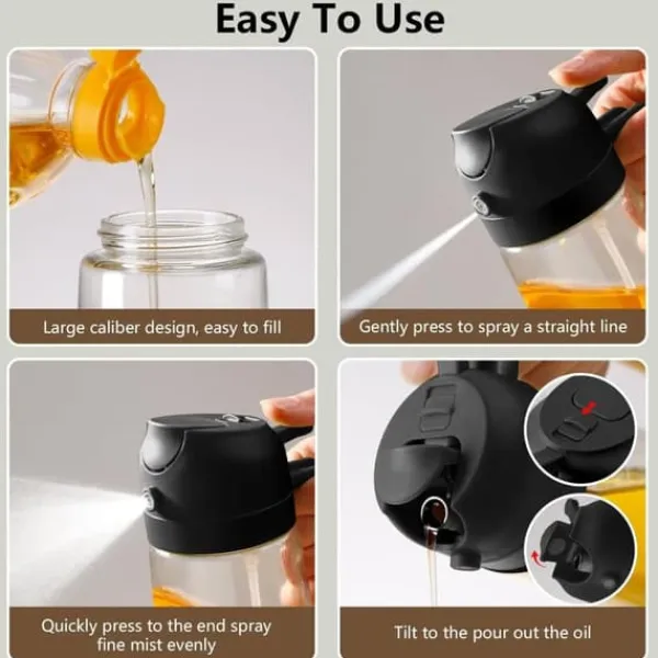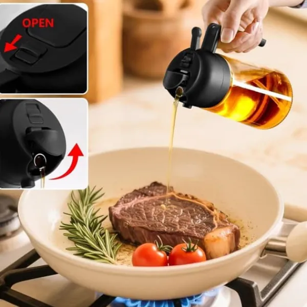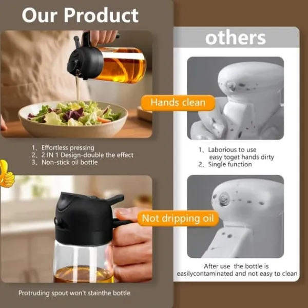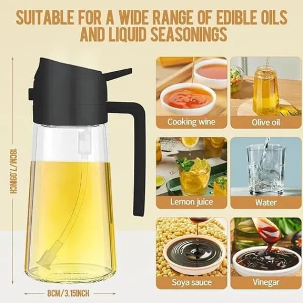 2-i-1 design: olieflaske og sprayflaske i ét. Kan sprøjtes for at kontrollere fedt- og olieindtag eller hældes for brugervenlighed. Perfekt til krydderier, grillning, bagning og anden madlavning.