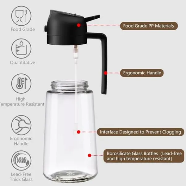 Fødevaregodkendte materialer: Fremstillet af BPA-fri PP og glas, robust og holdbar, svær at bryde. Glasflasken er blyfri og gennemsigtig, hvilket gør det nemt at se oliestanden.