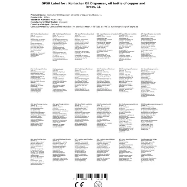 Oliekande, olier – 1L, kobber og messing, 200 mm x 145 mm Denne smukke oliekande er perfekt til opbevaring af olie og er ideel til brug ved spisebordet. Oliekanden er produceret i Portugal og har en ensfarvet finish, hvilket gør den ideel til hjemmebrug. Characteristics •Conic oiler •Produceret i Portugal •Ensfarvet finish •Ideel til hjemmebrug •Lakbehandling •Materiale: Kobber Messing •Vægt: 0,38 Kg •Højde X Diameter: 200 mm x 145 mm Denne oliekande er en praktisk og stilfuld tilføjelse til dit køkken eller spisestue. Med dens kobber og messing konstruktion vil den gløde smukt i lyset og give et elegant touch til dit hjem. Oliekanden er let at rengøre, og dens ensfarvede finish gør det nemt at matche med andre køkkenredskaber og indretning, den er også ideel til at give som gave. Oliekanden er udstyret med en lakbehandling, der beskytter den mod korrosion. Det betyder, at du kan bruge den til opbevaring af olie eller eddike uden at bekymre dig om, at det skader beholderen. Denne oliekande er perfekt til alle, der ønsker at tilføje lidt elegance til deres køkken og spisestue.