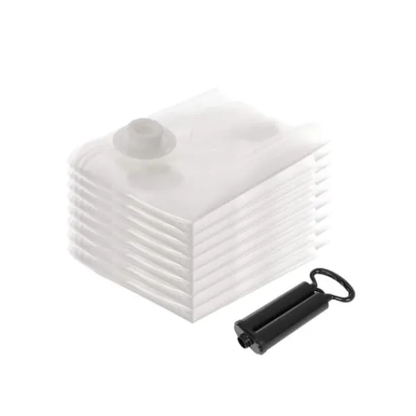 Mooistoerwonen 8-delt vakuumpose, kompressionspose med pumpe, genanvendelig til sengetøj, tøj, puder, dyner, gardiner, håndklæder, 8 60 x 40 cm. Vakuumposerne er helt transparente, selv lukkedelen i ventilen er transparent. Lukkestrimlerne, ventilen og lukkeglideren er hvide. Denne kombination gør poserne enkle og visuelt tiltalende. Vi har designet lukkeglideren i en oval form, og begge sider er bøjet indad, hvilket svarer til brugsvaner og ligger behageligt i hånden. Et ark med brugsanvisning medfølger produktet. Brug kun vakuumposerne som beskrevet i arket. Produktdetaljer: – Mål: 60 x 40 cm (L x B) – Emballagemål: 54 x 50 x 36 cm – Farve: transparent – Materiale: PE + PA – Vægt: 0,61 kg Leveringsomfang: – 8 x vakuumposer – 1 x lille pumpe.