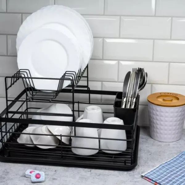 Tørretumbleren vil finde sin anvendelse i både store og små køkkener. Den universelle farve får den til at se godt ud i ethvert interiør. Opvaskeafløbet er desuden udstyret med en praktisk bestikbeholder. Opdelingen i 2 rum gør det nemt at sortere skeer, gafler og knive. Produktet gør det nemmere at holde orden i køkkenet. Opvasketørreren i to niveauer er stabil, hvilket sikrer sikker brug. Produktet har specialdesignede ben, der er solidt forbundet til tørretumbleren. Takket være dette er der ingen risiko for at vælte, selv når den er tungt læsset med service. Egenskaber: -Højkvalitets pulverlakeret metalramme -Slidstærk metalkonstruktion -Lille afløb med riller til at holde et maksimalt antal tallerkener -Bakke i bunden forhindrer køkkenet i at blive vådt -Kun håndvask, tør umiddelbart efter vask -Aftagelig plastikbestikafløb Mål: 43 x 32 x 27 cm