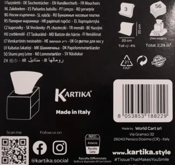 Ansigtslommetørklæder i en æske 56 stk. Kartika Mandala Black&White er 3-lags sarte ansigtslommetørklæder. De er lavet af papir af høj kvalitet, som er absorberende og samtidig holdbart .