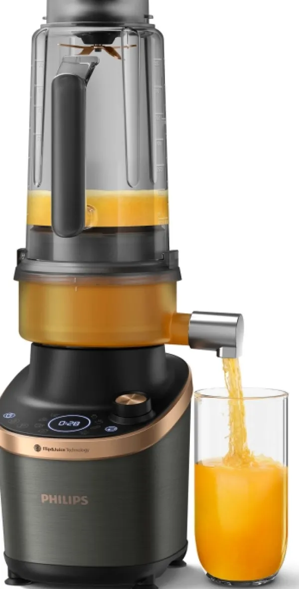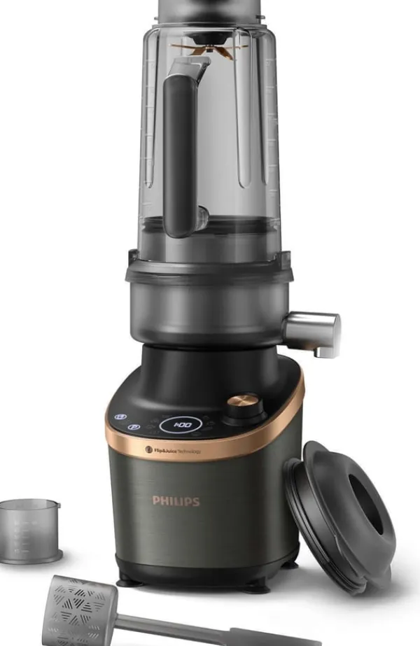 Den nya Philips Flip&Juice-mixern är Philips första mixer som inkluderar en juiceenhet. Tack vare kannans revolutionerande design och det integrerade filtret kan juicens sammansättning justeras för att passa din familjs preferenser. Med den avancerade och multifunktionella mixern kan du trolla fram silkeslena smoothies såväl som klara och fruktiga juicer. Eftersom enheten kombinerar en mixer och en juicepress sparar den också utrymme i köket.