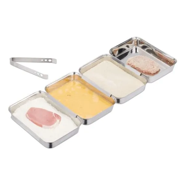 Hvis panerede godbidder som schnitzel er en del af din kost, er dette paneringssæt et must-have i dit køkken. Denne paneringsstation giver dig mulighed for effektivt at panere kød, fisk eller endda grøntsager. Paneringsbakkerne er forbundet med hinanden, hvilket forhindrer panering i at spildes på din køkkenbordplade, når du flytter den panerede mad fra en bakke til den næste. Tangen giver et sikkert greb. Ligesom bakkerne er de lavet af rustfrit stål.