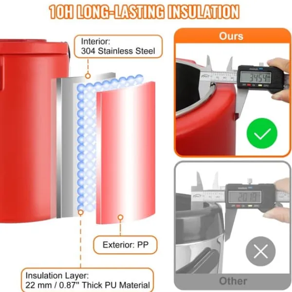 Vores varme- og kolde drikkeautomater er fremstillet med en to-lags rustfri stålkonstruktion og en 22 mm tyk PU-skumisolering, der giver fremragende isolering. Den holder dine drikkevarer varme eller kolde i op til 10 timer uden brug af elektricitet eller en anden energikilde. Hold indvendig temperatur konstant med vores tætsluttende låg!