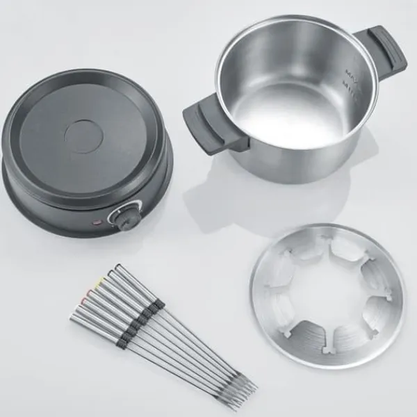 Elektrisk fondue för 8 personer för Savoyard-, Burgund-, Kinesisk- eller chokladfonduer enligt dina önskemål – Avtagbar gryta i rostfritt stål, kan diskas i diskmaskin – Kapacitet: 1,4 L – Stänkskydd med tillbehör för gafflarna – Värmebeständig plastbotten – Isolerade handtag – Justerbar termostat med överhettningsskydd – 1 meter strömkabel
