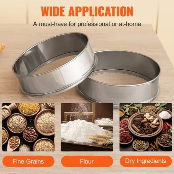 Bred anvendelse: Udbredt i restauranter, bagerier, melmøller, hjemmekøkkener osv., ideel til at sigte og filtrere urenheder og klumper fra tørre ingredienser såsom mel, sukker og krydderier, såvel som til korn som bønner, ris og pasta.