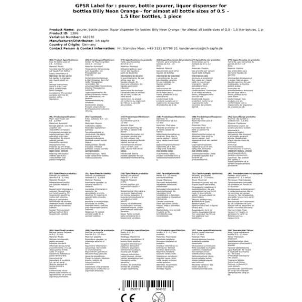 Skænkeprop, Hældetud Billy Neon Orange, til næsten alle flaskestørrelser fra 0,5 – 1,5 liter, 1 stk Tag din serveringsoplevelse til næste niveau med vores Billy Neon Orange hældetud! Skænkeren giver ikke kun et elegant look, men også præcis dosering og nem håndtering ved servering af drinks. Her finder du al vigtig information om vores skænker: Universal pasform •Takket være dets innovative design er Billy Neon Orange skænker velegnet til næsten alle flaskestørrelser fra 0,5 til 1,5 liter. •Den integrerede justering sikrer, at hældetuden passer perfekt til flasker i alle størrelser og giver mulighed for ubesværet hældning. •Med kun én udskænker kan du arbejde effektivt og undgå behovet for dyre, specielle udskænkere. Nem håndtering og præcis dosering •Billy Neon Orange hældetuden giver mulighed for en problemfri serveringsoplevelse takket være dens præcise dosering. •Tuden kan fastgøres til flasken med én hånd, og væsken kan hældes på en kontrolleret måde, uden unødvendige spild eller spild. •Det betyder, at hver drink bliver en perfekt oplevelse for dine gæster, og du garanterer optimal kvalitet af din service. Hygiejnisk og holdbar •Billy Neon Orange-skænkeren er lavet af robust plastik, som garanterer lang levetid og nem rengøring. •Dens hygiejniske fordele gør den til et økonomisk alternativ til dyre hældekasser i rustfrit stål og ideel til brug i restauranter og andre butikker. •Hældetuden er nem at rengøre og vaske, og den kan bruges igen og igen, hvilket giver en effektiv investering for fremtiden. Forbedre din serveringsoplevelse og reducer omkostningerne med Billy Neon Orange hældetud •Vores Billy Neon Orange tud overbeviser ikke kun med sin funktionalitet, men også med sit attraktive design i iøjnefaldende neon orange. •Dette alsidige og praktiske produkt gør det muligt at hælde væsker fra en lang række flaskestørrelser hurtigt og på en kontrolleret måde, hvilket sikrer optimal kvalitet af din service. •Det optimale forhold mellem pris og ydeevne og høj effektivitet gør Billy Neon Orange-skænkeren til en investering for fremtiden for din virksomhed. •Bestil din Billy Neon Orange hældetud nu og opdag de fordele, du ikke vil kunne undvære! •Spar omkostninger, reducer spild og forbedre din serveringsoplevelse med vores Billy Neon Orange hældetud! •Et must-have for enhver bartender og restaurant! •Det perfekte tilbehør til alle cocktailelskere! •Ideel til alle typer begivenheder, barer, restauranter og pubber. •Takket være dens holdbare og hygiejniske plastik er vores Billy Neon Orange skænker også velegnet til brug i catering og andre virksomheder.