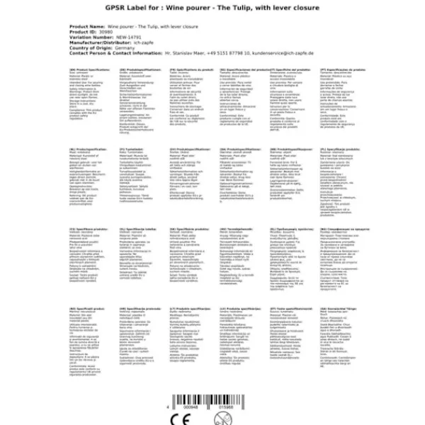 Skænkeprop vin – The tulip, med håndtagslås Skænkeprop vin The tulip med håndtagslås – 2 i 1-funktion (stang og lås), som vil give dig en jævn og drypfri hældning. Låsefunktionen beskytter din vin mod støv og miljøpåvirkninger. Derudover er den nem at pleje og nem at bruge. Funktioner • The tulip skænkeren med håndtagslås giver dig en jævn og drypfri hældning. • Dens unikke låsefunktion beskytter din vin mod støv og miljøpåvirkninger. • Nem at pleje og vedligeholde, vil din skænkeprop blive brugt år efter år. • En perfekt gave til enhver vinentusiast. Specifikationer • Materiale: Rustfrit stål • Farve: Sølv • Størrelse: 10 x 5 x 5 cm Udtrykket Skænkeprop vin er synonymt med kvalitet, og med denne skænkeprop kan du ikke gå galt i byen. Køb din TULIP-skænker med håndtagslås i dag og start med at nyde dit yndlings glas vin på den bedst mulige måde.