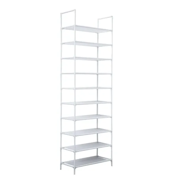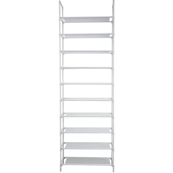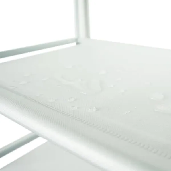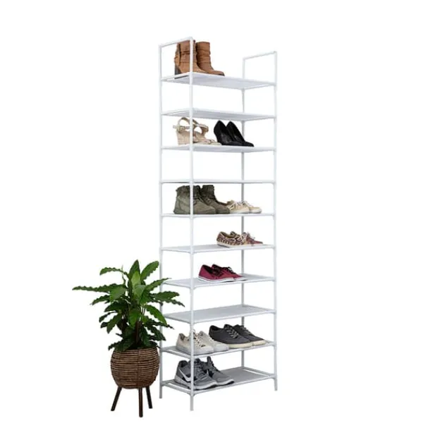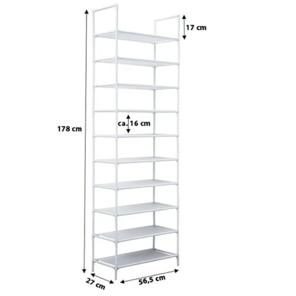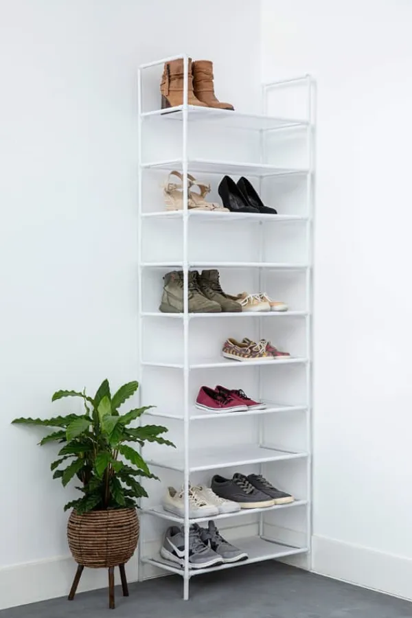 Denne skoreol i hvid metal giver dig et stilfuldt hjem til 20 par sko. Den er robust og høj og ideel til pæn opbevaring af mange sko på et lille område. Membranen på hylderne er vandafvisende og forhindrer vand fra våde sko i at sive ind. Snavs som støv og sand kan også nemt tørres af med en fugtig klud. Plastikbenene forhindrer ridser i gulvet. Skoreolen er hurtig og nem at samle. Reolen er mobil, men for ekstra stabilitet kan den også vægmonteres med de medfølgende rawlplugs.
