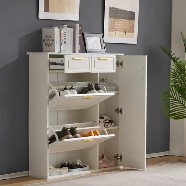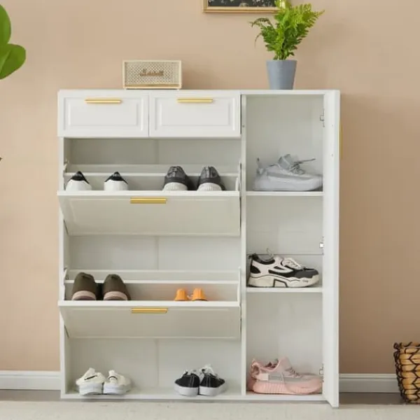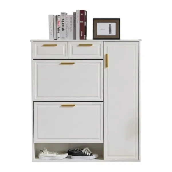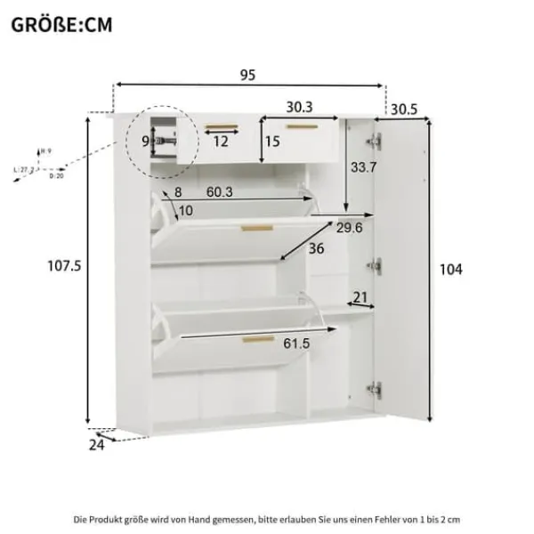To små skuffer giver plads til mindre genstande såsom nøgler eller kort. Flere rummelige rum og praktiske åbne hylder giver plads til ca. 10-15 par sko i forskellige størrelser og typer, og de justerbare hylder i forskellige størrelser giver dig mulighed for fleksibelt at justere pladsen afhængigt af skostørrelse eller andre ting.
