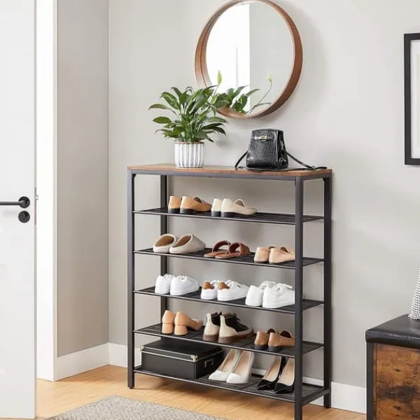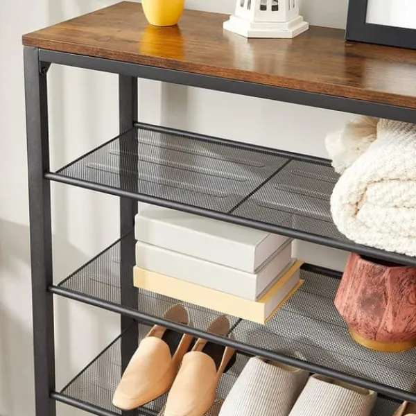 – Du behöver inte oroa dig för lagringsutrymme! Denna 5-våningshylla ger tillräckligt med utrymme för 20 par snygga skor och ger dem en perfekt scen att glänsa på. Den iögonfallande vintageytan är perfekt för väskor, nycklar eller små växter.