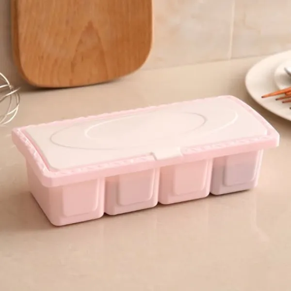 Denne krydderibeholder af plastik har et design med fire gitter, der giver dig mulighed for at opbevare køkkenkrydderier separat, såsom salt, peber, chilipulver og granuleret sukker. Den er lavet af førsteklasses plastik, hvilket gør den sikker, giftfri og lugtfri. Beholderen er holdbar, nem at rengøre og meget praktisk at bruge. Designet med én beholder gør den nem at åbne og lukke, hvilket sikrer en tæt og fugttæt funktion. Dette krydderibeholdersæt er et fantastisk køkkenhjælpemiddel til både husholdningskøkkener og restauranter.