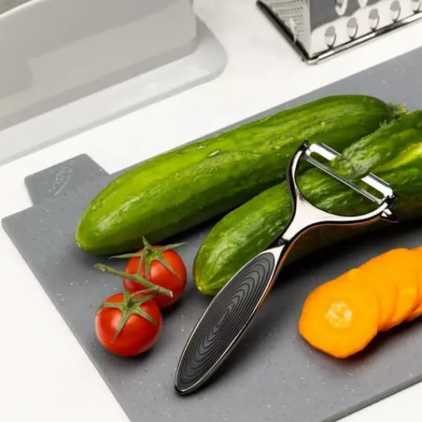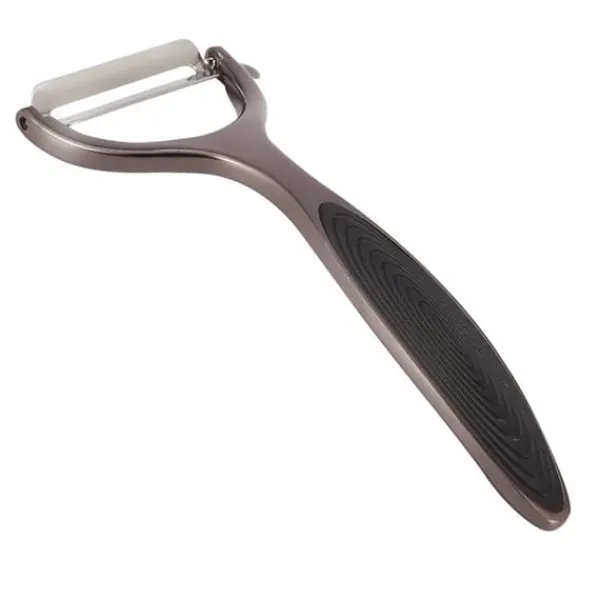 Stålskræller til grøntsager og frugter i grafitfarve. Skridsikkert, ergonomisk håndtag med silikoneindsats.