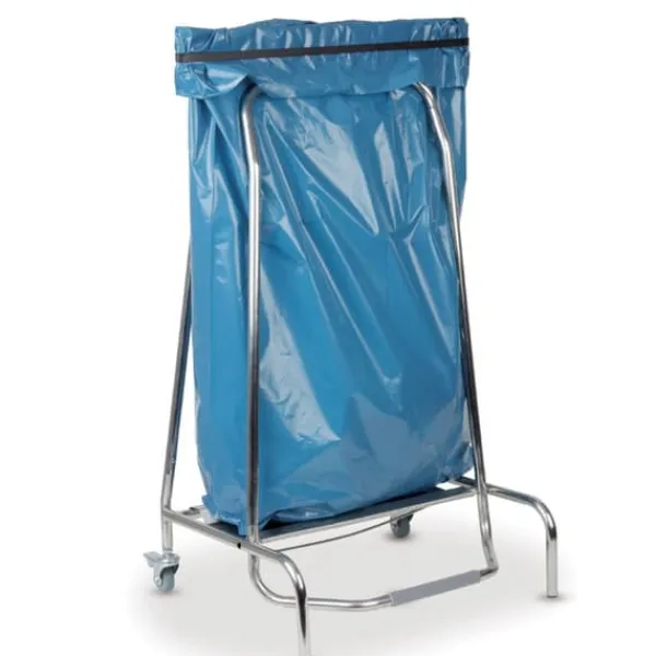 Producentnummer: 691021 Stativ til affaldspose – Stel af rustfrit stål – Fodbetjent klemknap til at åbne posen – 2 hjul med bremser – Rammen er designet til en pose, der måler ca. 60×90 cm liter Stativet sælges uden poser! Parametre: – mål: 420x580x(H)960mm Sættet indeholder: – Stander, affaldsposeramme med fodlukning