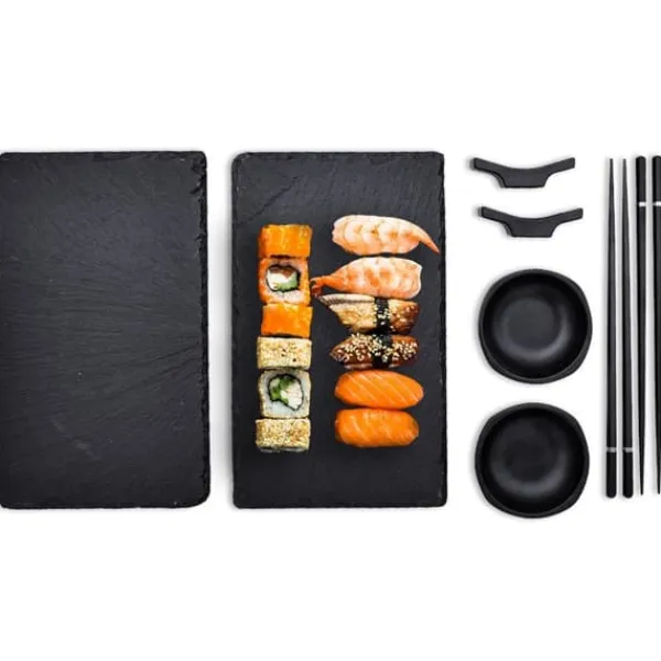 Unna dig en autentisk sushimiddag hemma med vårt fantastiska Sushi Set för Två. Detta eleganta set i mattsvart har allt du behöver för en angenäm upplevelse för två personer2 par ätpinnar, 2 skiffer serveringsplattor, 2 sojasåsskålar och 2 ätpinnstöd. Tillverkad av hållbart och stadigt restaurangkvalitetsmaterial är detta set byggt för att hålla länge. Till skillnad från keramikset som lätt kan gå sönder, är detta set designat för många års njutning. Det är lätt att rengöra och tål maskindisk (förutom ätpinnarna). Setet levereras i en vacker, elegant förpackning, vilket gör det till den perfekta presenten för sushiälskare!