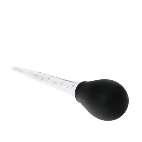 Øsepipette af plastik og silikone med tilhørende rengøringsbørste. Samlet længde: 29 cm. Perfekt til øse af stege og fjerkræ.