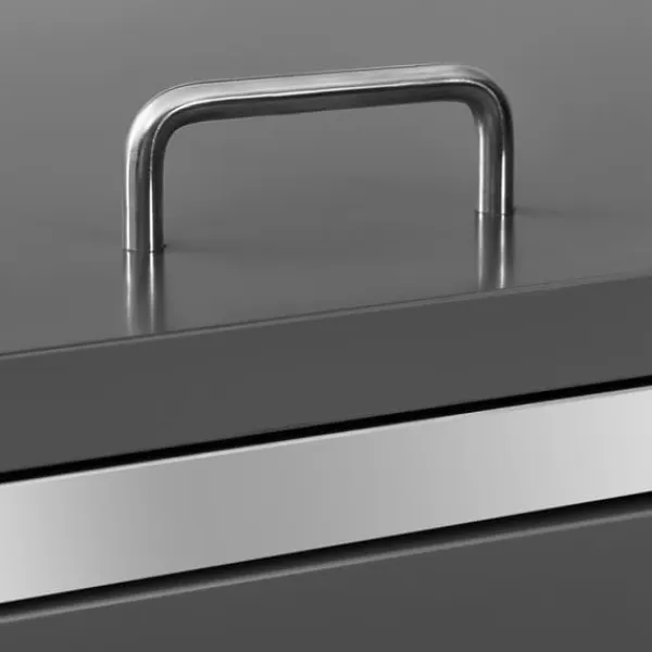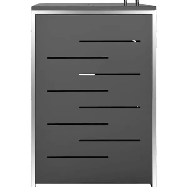 Dette skraldespandsskur er lavet af galvaniserede stålpaneler og et stel i rustfrit stål, hvilket gør det yderst robust og rustbeskyttet. Det hullede design tillader luftcirkulation og forebygger dårlige lugte i skraldespandsskjuleren. Låsesystemet garanterer sikker opbevaring af skraldet. Ydermere gør det praktiske låg og fjedre det nemt at smide skrald ud i skraldespanden og tømme den igen.