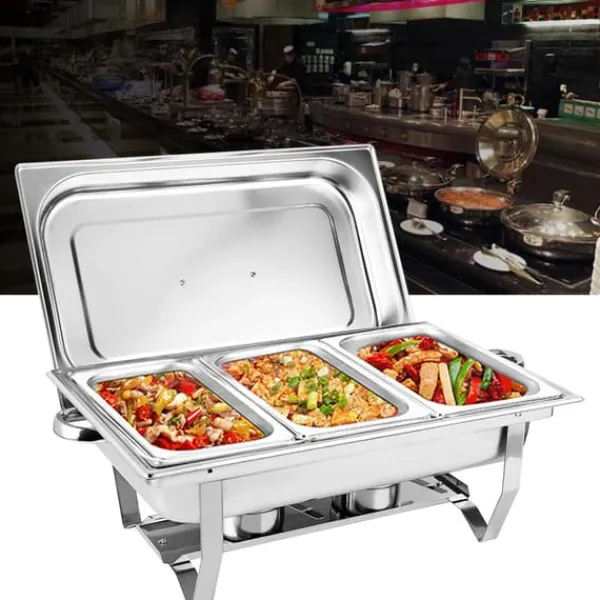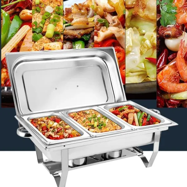 Chafing dish i rustfrit stål med 3 x 3 L madbakkerDenne rektangulære varmholder i rustfrit stål holder retter varme og indbydende til buffeter, brunch, catering, fester og bryllupper. Med tre madbakker à 3 L kan du servere flere retter på én gang med flot præsentation.